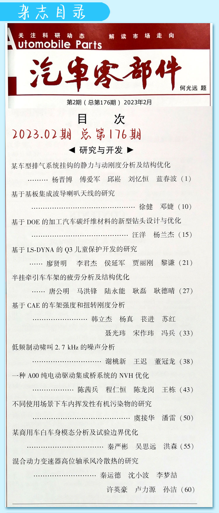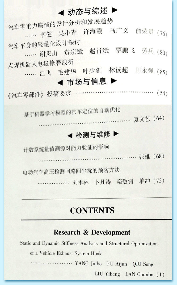 《汽車零部件》內容上著重市場信息傳播和技術介紹雙重并重,在市場信息方面主要介紹汽車零部件產品國內外市場動態、趨勢分析、政策導引;在技術介紹方面涉及理論研究、產品設計制造工藝技術、設備使用維修和技術改造方面的最新科研生產成果和國內外最新發展動向。