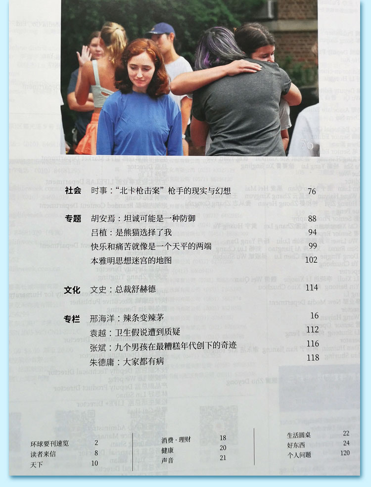 除封面故事、獨家的社會、財經、文化深度報道外,另設一周時事、社會、財經、文化專欄及環球要刊速覽、讀者來信、生活圓桌、聲音等特色欄目。