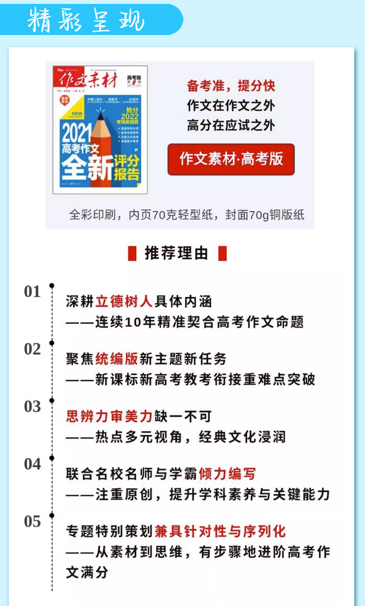 《作文素材高考版》是為高考考生量身打造的作文教輔期刊,聚焦高考作文為同學們分析命題方向,考察熱點與考試重點都能了解到還有名師傳授寫作技巧,助力學生打贏這場人生戰斗。由著名作家、北京大學中文系教授孔慶東先生擔綱顧問,全國3000余名一線教師任編委,傾力解決中學生作文的三大問題: