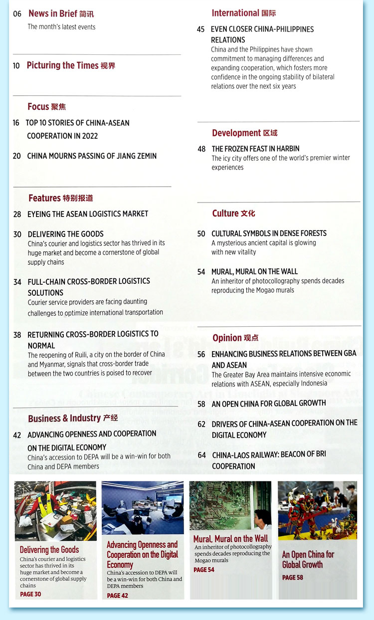《中國東盟報道》由中國外文局主管、中國報道雜志社主辦的國家級英文月刊——《中國東盟報道》(CHINAREPORTASEAN)1月15日在廣西南寧舉行創刊發布會。該刊致力于打造多媒體多終端中國財經資訊媒體平臺,實現對東盟國家的全覆蓋。根據《中國東盟報道》的整體規劃,該平臺將視東盟各國互聯網及基礎設施建設的實際情況,以平面紙媒為基礎,在當地逐步開展媒介推廣活動,進而實現對東盟國家的全覆蓋。