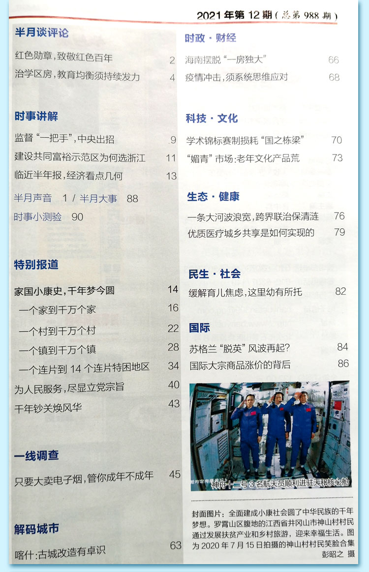 《半月談》以積極熱情地宣傳當的方針政策、當好黨和人民的耳目喉舌為己任,堅持圍繞黨和國家重大決策的出臺確定報道選題,及時準確地解讀中央的方針政策。