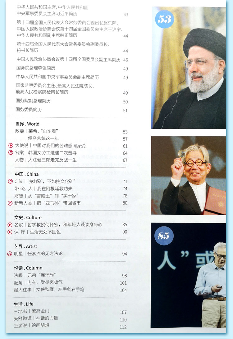 內容定位:以國際和國內政治、經濟、文化領域高端人物為報道對象,突出全球視野,強調時效性、權威性、可讀性。