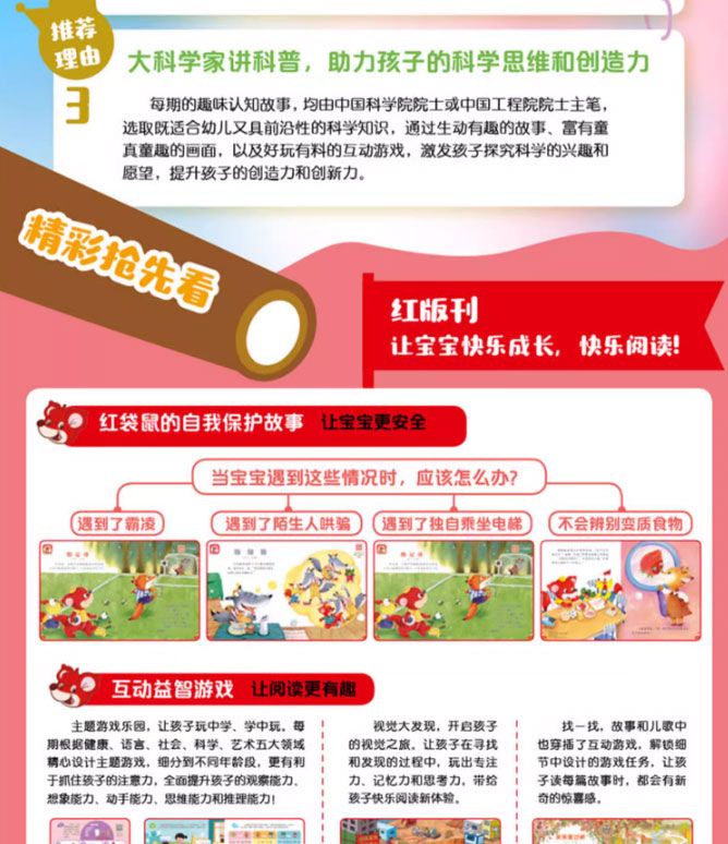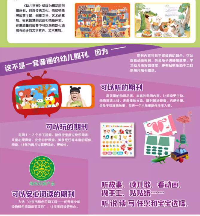 《幼兒畫報》以教育部頒布的《幼兒園教育指導綱要》為指導,樹立高度的責任感,創設適合中國幼兒身心發展的欄目及內容,如:“紅袋鼠的自我保護故事” “好習慣故事” “寶寶唱成語故事” “奧運城堡漫游記”等欄目。每篇故事均由著名幼兒教育專家指導, 保證了《幼兒畫報》的專業性和權威性。