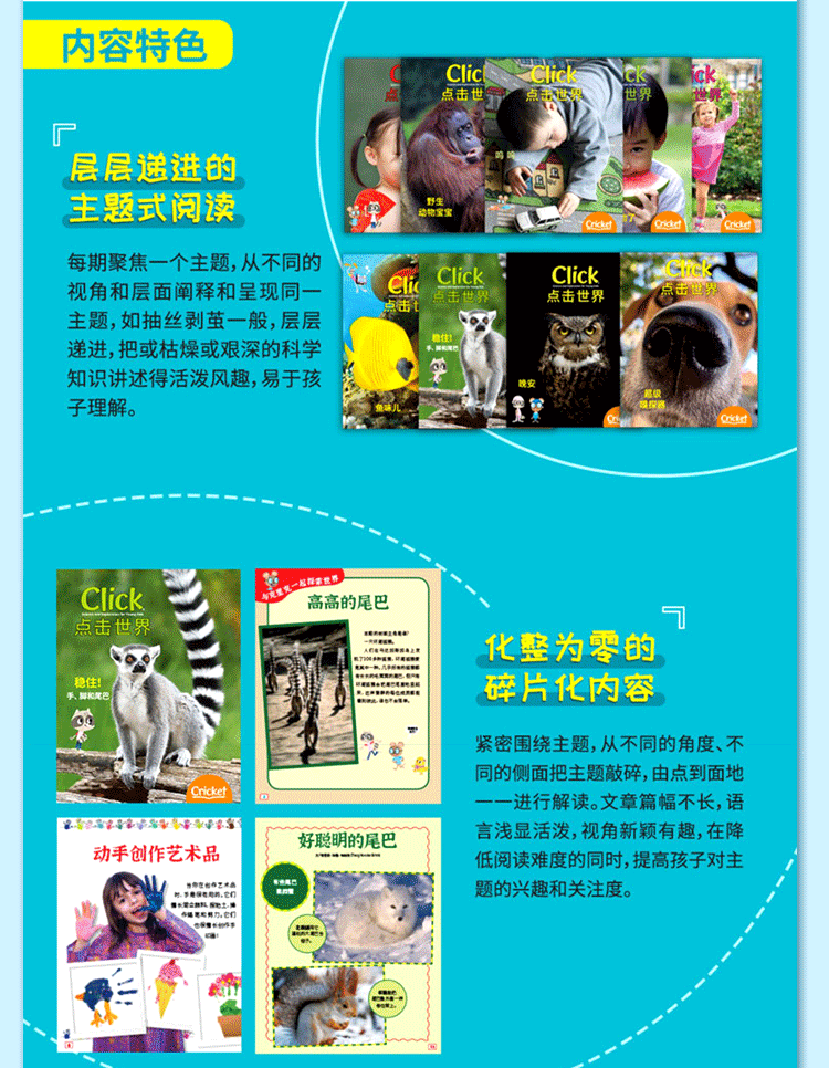 《點擊世界Click中文版》每一期《點擊世界》的內容都和當期英文版雜志保持高度步調一致,因此所有內容都是新鮮出爐的,而不是過刊文章的重新排列組合。依托Cricket Media強大高效的編輯制作團隊,其在每一期的出版時間上也與英文版保持相同,當月一起推出。