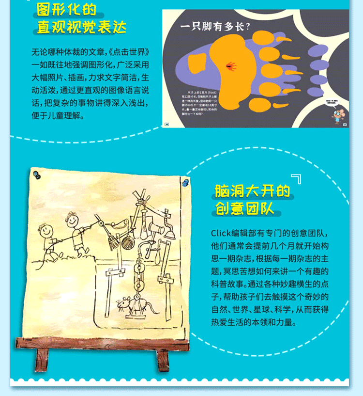 雜志概要:《點擊世界Click中文版》每一期的內容都和當期英文版雜志保持高度步調一致,是一本用簡單風趣的方式,向孩子們介紹科學、藝術、自然和環境的活潑的科普雜志。。