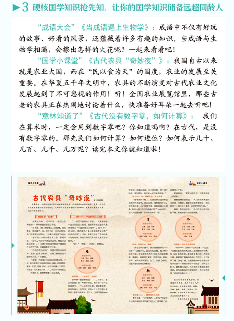 《意林·小國學》,中小學傳統文化養成讀本,青少年國學知識備考刊物。它注重對青少年傳統文化素養、閱讀理解能力、表達能力的培養,從傳統國學寶藏中汲取精華,選取符合學生閱讀習慣的動人故事,將海量國學知識點融入其中,以活潑有趣的圖畫形式展現,讓孩子們愛上國學經典,增加傳統文化底蘊,提高人文素養,在閱讀中領悟中華傳統文化的魅力。內容涵蓋神話故事、歷史故事、人物故事、詩詞成語、傳統節日等多個板塊,涉及文學、美學、哲學、音樂、藝術.書法、繪畫等各個方面,搜羅課本上學不到的故事,補充課外所需語文基礎知識,從小讓孩子讀經典,面對初高中的國學經典書目才能水到渠成,是一本專為7到15歲青少年打造的不可多得的國學刊物。解決孩子不愛閱讀,語文基礎知識薄弱等問題。它以五千年歷史的深邃眼光,賦予孩子歷代圣賢的崇高智慧,延續中華英雄兒女的大愛氣節,鍛造孩子心懷天下的博大胸懷;提前為小升初及中高考語文傳統文化、國學知識相關題目備考,創刊至今,多次 “巧遇”全國多地小升初和中考語文考試題內容,是一本值得收藏的備考雜志。