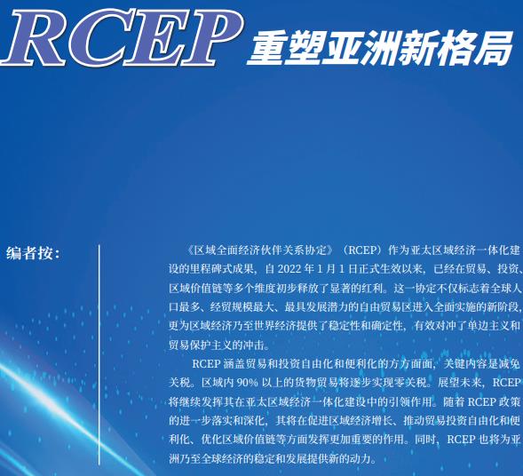 作為亞太區(qū)域經(jīng)濟一體化建設(shè)的里程碑式成果,《區(qū) 域全面經(jīng)濟伙伴關(guān)系協(xié)定》(RCEP)是區(qū)域國家共享發(fā)展 機遇的生動范例。兩年多來,區(qū)域貿(mào)易成本大幅降低,產(chǎn)